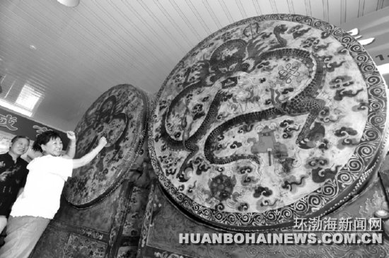 7月11日,一对直径近两米的彩绘巨鼓出现在长宁道花卉市场内,引来众多市民好奇目光。据“鼓王”的主人栗先生介绍,该鼓是他花重金从内蒙古购得,是清朝年间的战鼓,每只售价在2万元以上。图为市民在亲身体验巨鼓声响。记者郑勇摄