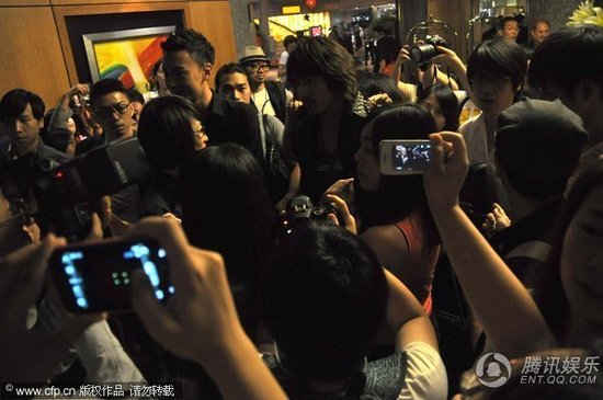 腾讯娱乐讯(CFP/图文)上海,日前,言承旭、郑元畅与吴君如现身酒店被众多粉丝围堵场面混乱。
