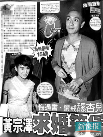 复合心切的黄宗泽,据说急忙订了一枚3卡钻戒,等月底返香港即向胡杏儿求婚。知情者说:“他送过不少钻石给杏儿,就是没有戒指,因为有些事情他不想进展这么快,以为自己还有得玩。这次不同,要复合就要表现十足诚意,送钻戒就代表用下半生的自由作交换。”