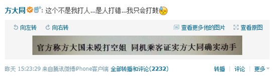 9月2日15:23,方大同在微博中放出一张媒体标题的截图,上面写明:“官方称方大国未殴打空姐同机乘客证实方大同动手”。该消息显然张冠李戴,将方大国打成了方大同。对此,方大同无奈的辩白:“这个不是我打人……是人打错……我只会打鼓。”