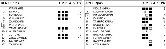 此役,中国女排雪藏了队长魏秋月和重炮王一梅,首发阵容是:主攻惠若琪、楚金玲,副攻杨珺菁、徐云丽,二传米扬,接应曾春蕾,自由人单丹娜。中国女排惠若琪、曾春蕾轰下了全队最高的15分,杨珺菁贡献了11分,徐云丽拿下9分,楚金玲进攻遭到遏制,取得了6分。其中惠若琪25扣12次得分,只有3次失误,是全队扣球命中率最高的球员。日本队只有一人得分上双,石井里沙取得了14分。此役,中国女排进攻得分37比33压制对手,拦网得分16比4遥遥领先,发球得分5比1也占据优势。