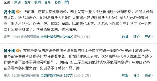 随后,冯小刚连续发两条微博,进行回应,“零钱电影院的意思,是在城乡结合部的打工子弟学校辟一间教室免费装上放映设备,由华谊免费供片给孩子们零分钱看电影,现在已建成四五家。这好事居然也有人跳脚骂‘恶心作秀有钱不给孩子买书买吃的。’ 想问:打工子弟就只能顾温饱不能看电影吗?免费给这些孩子看电影何罪之有?您倒是不作秀您作恶。”