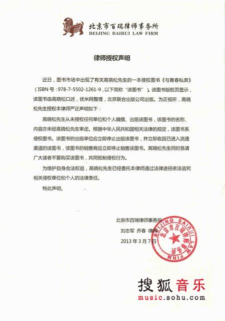为正视听,高晓松先生授权本律师严正声明如下: