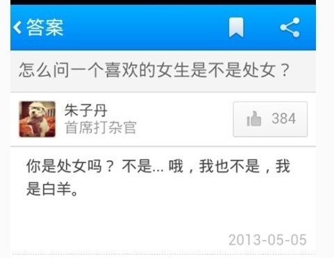 有屌丝问了一个二缺问题:怎么问一个喜欢的女生是不是处女,于是,他得到了下面让人风中凌乱的回答……