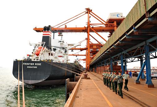8月27日,曹妃甸边防检查站的官兵在曹妃甸口岸矿石二期码头巡逻。记者从曹妃甸边防检查站获悉,曹妃甸口岸自2012年8月28日正式对外开放,截至今年8月28日,出入境船舶达2256艘次,进出口货物达1.17亿吨。新华社记者 杨世尧 摄