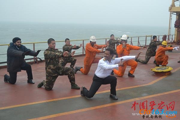 4名官兵向外国船员展示了令人眼花缭乱的长拳、太极等武术表演,这是中国人心中熟悉的民族风采,更是外国人眼中神奇的“功夫”;看到如此精彩绝伦的表演,外国船员纷纷向边检官兵拜师学艺,现场气氛热烈,掌声、叫好声接连不断。最后,船长雷恩带领船员们,与边检官兵合影留念。