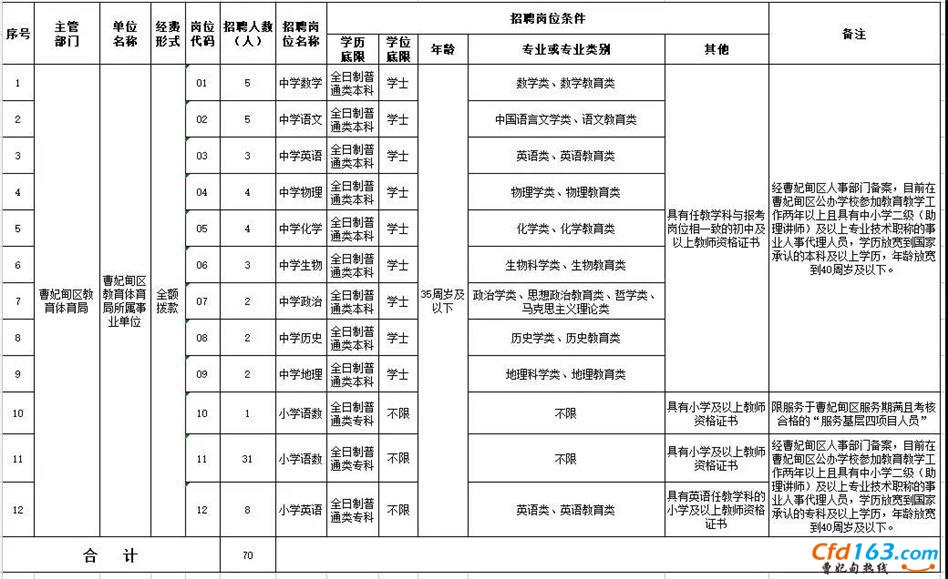 本次公开招聘教师70名。岗位条件详见《2019年唐山市曹妃甸区教育系统所属事业单位公开招聘教师岗位信息表》(附件1)。